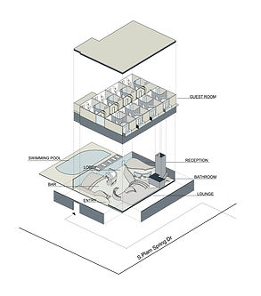 LA is a quiet romantic place that is perfect for couples especially some places such as palm spring. In the back site of the original building, there is good mountain view. There is a good opportunity to put the balcony and swimming pool here.Because Palm spring is in the desert area which is always dry and hot. So I did a sun study to figure out which parts get direct sunlight and which parts is cooler. From the site analysis block scale. I nd that there is lot of restaurants around this area but not many hotel.So it is a good opportunity to design a boutique hotel here.